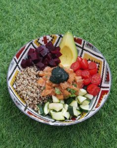 Prendre une assiette creuse ou un bowl et disposer les ingrédients au fur et à mesure ; commencer par le quinoa, puis le tartare de saumon. Ajouter ensuite la betterave, l’avocat, les tomates cerises, les dés de courgettes.Pour finir, déposer la crème de spiruline et ajouter si besoin un peu d’huile, de citron sur le bowl.